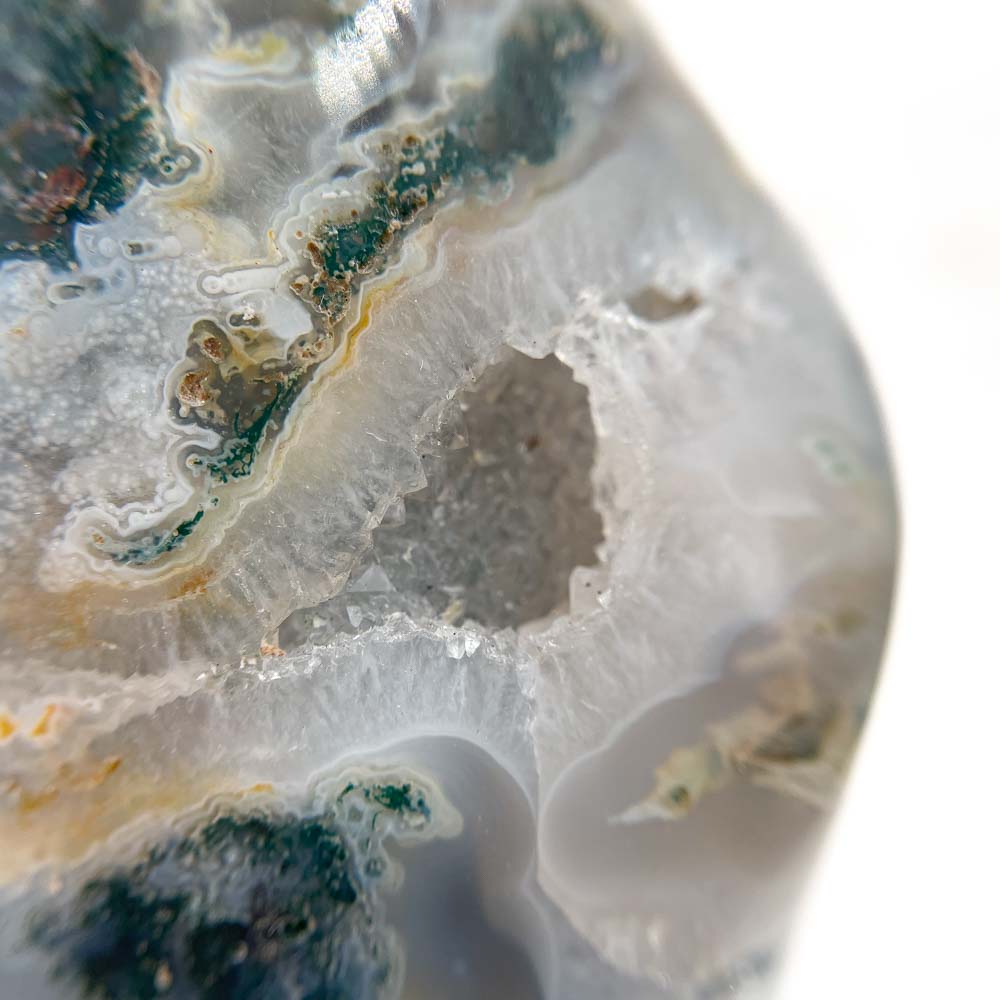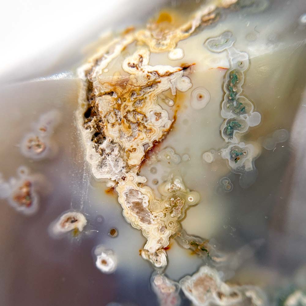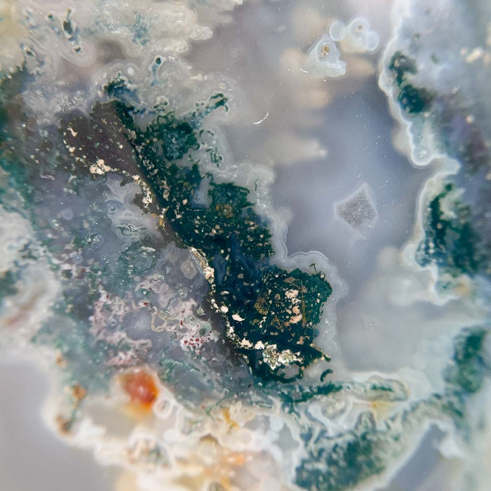 Этот вид агатов один из самых необычных: в каждом камне рисунок напоминает или прозрачное озеро с водорослями вокруг или сыр с плесенью, если сам камень белого цвета