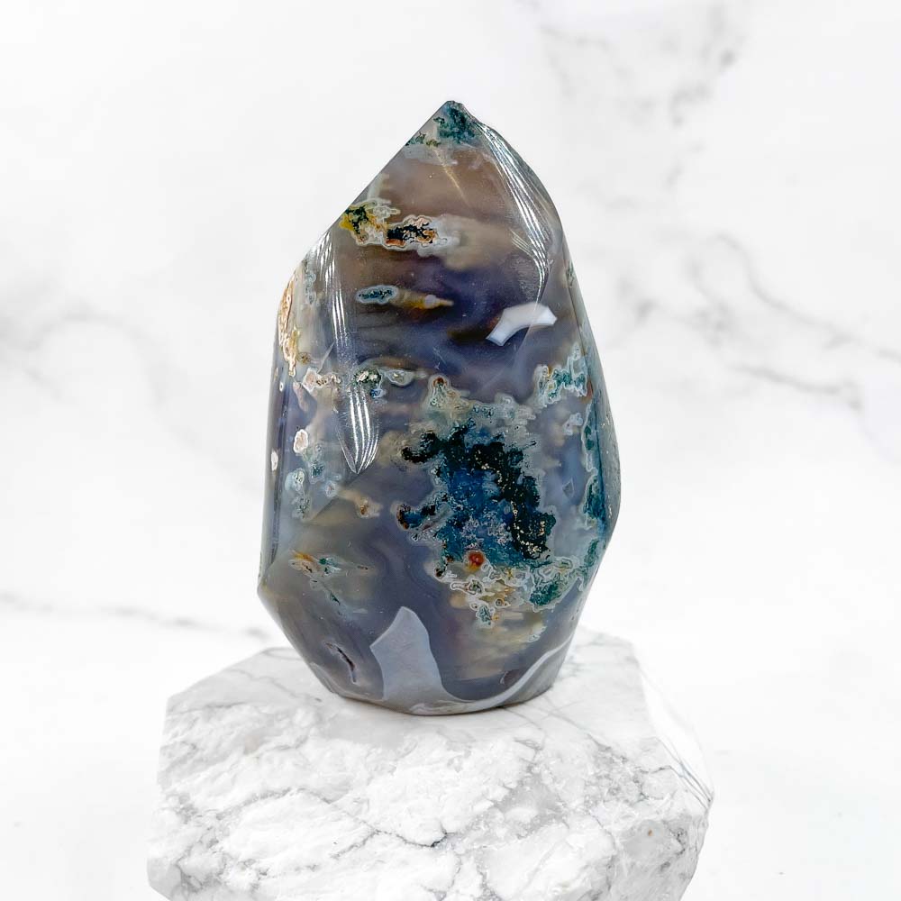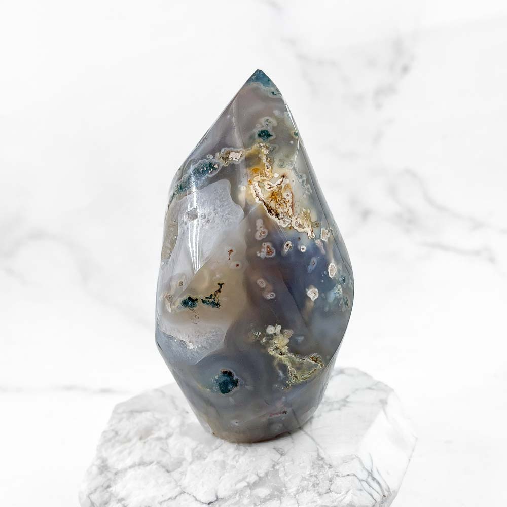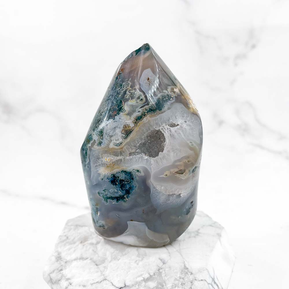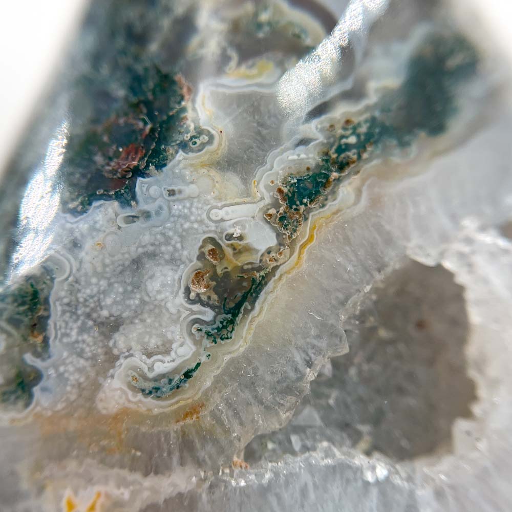 Этот вид агатов один из самых необычных: в каждом камне рисунок напоминает или прозрачное озеро с водорослями вокруг или сыр с плесенью, если сам камень белого цвета