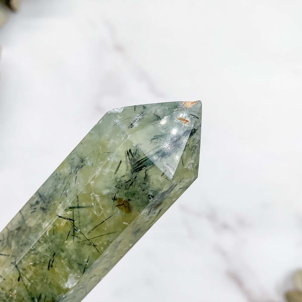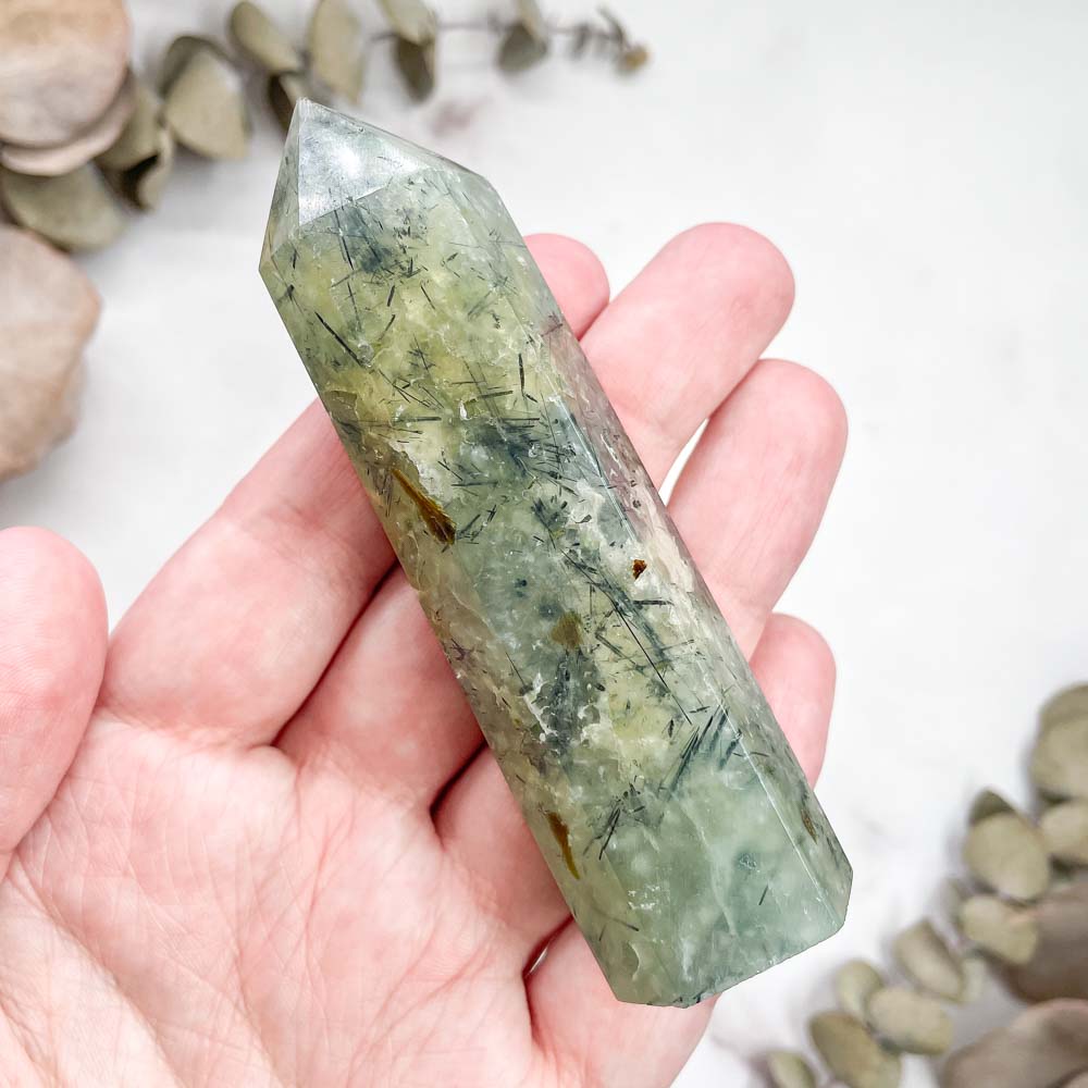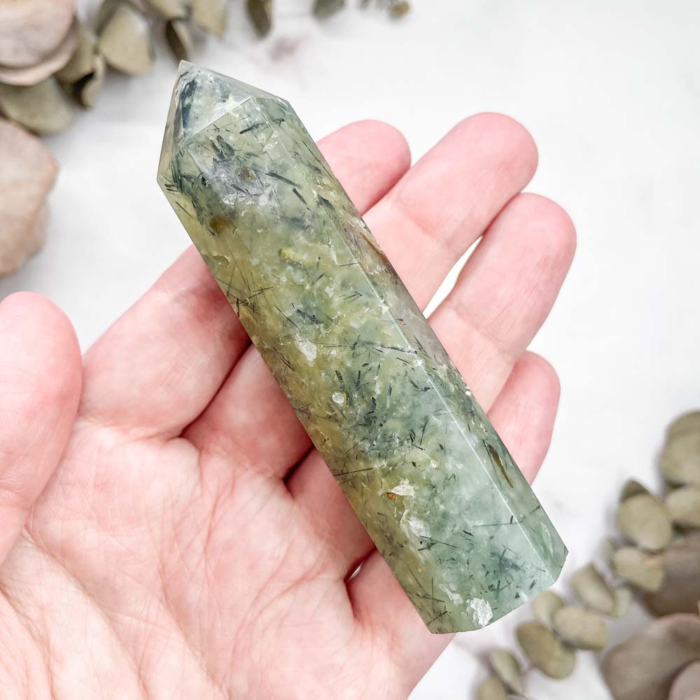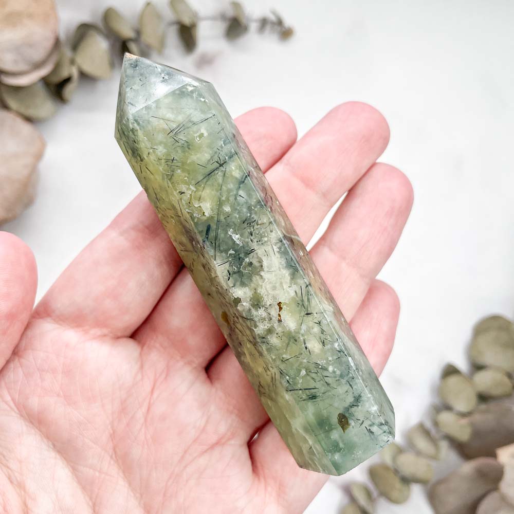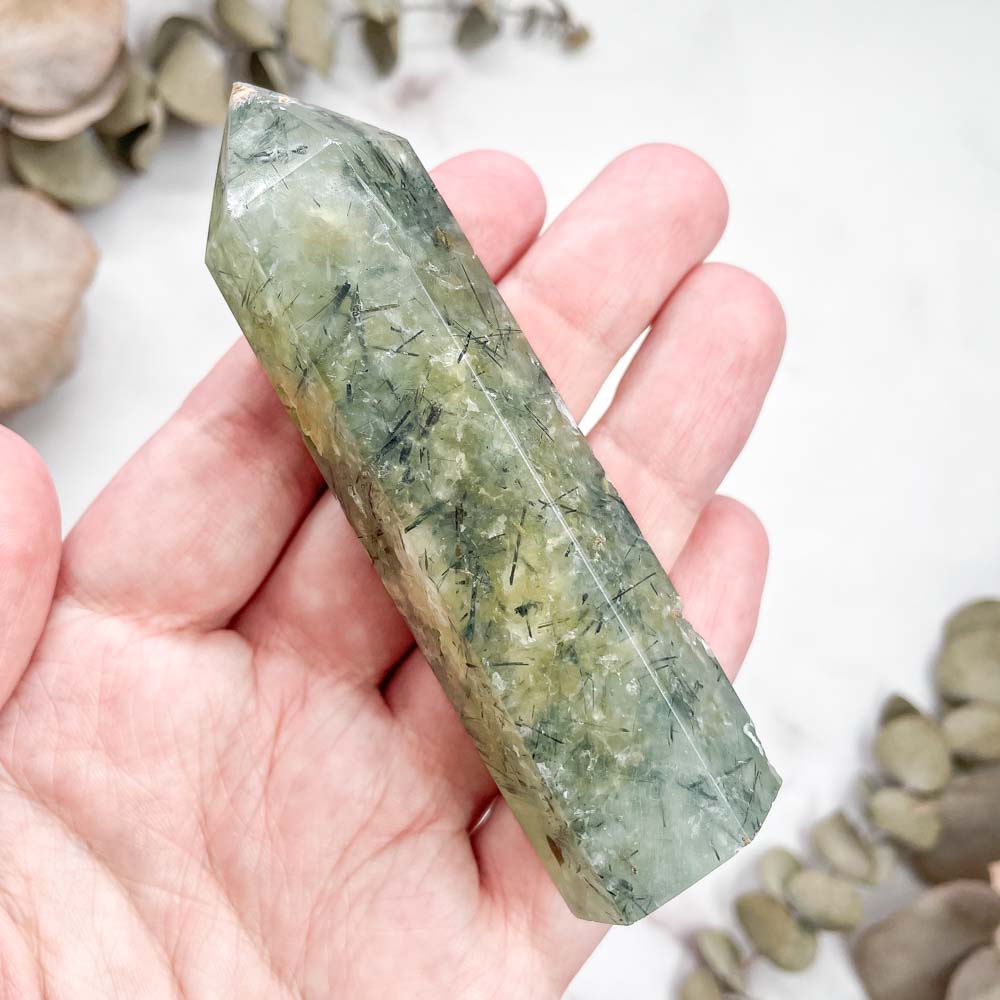 Состав эпидота характеризуется наличием таких химических элементов, как железо, алюминий, кальций и кислород. Обычно образуется при преобразовании Ca (кальций) содержащих пород с участием водных растворов от 50 до 150 градусов. Эпидот часто встречается в виде призматических, пластинчатых кристаллов, в форме массивов и, в частности, в форме иголок, которые могут образовываться в слиянии с таким камнем, как пренит. На ментальном уровне эпидот усиливает эзотерические свойства пренита и дополняет его в качестве обострения внимания и восприятия. Данное сочетание способствует духовному исцелению и восстановлению, помогает уравновесить свой быт и раскрыть своё сердце для любви к миру.