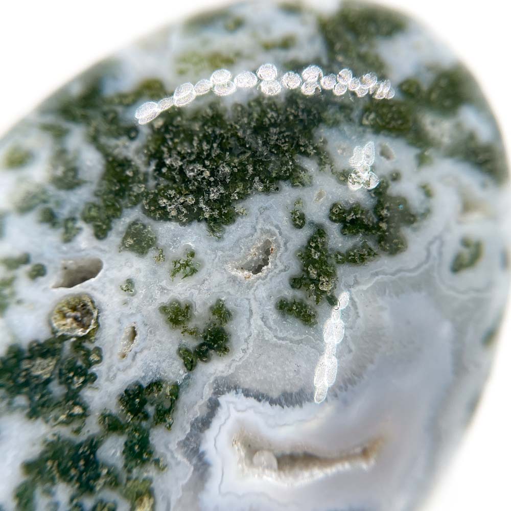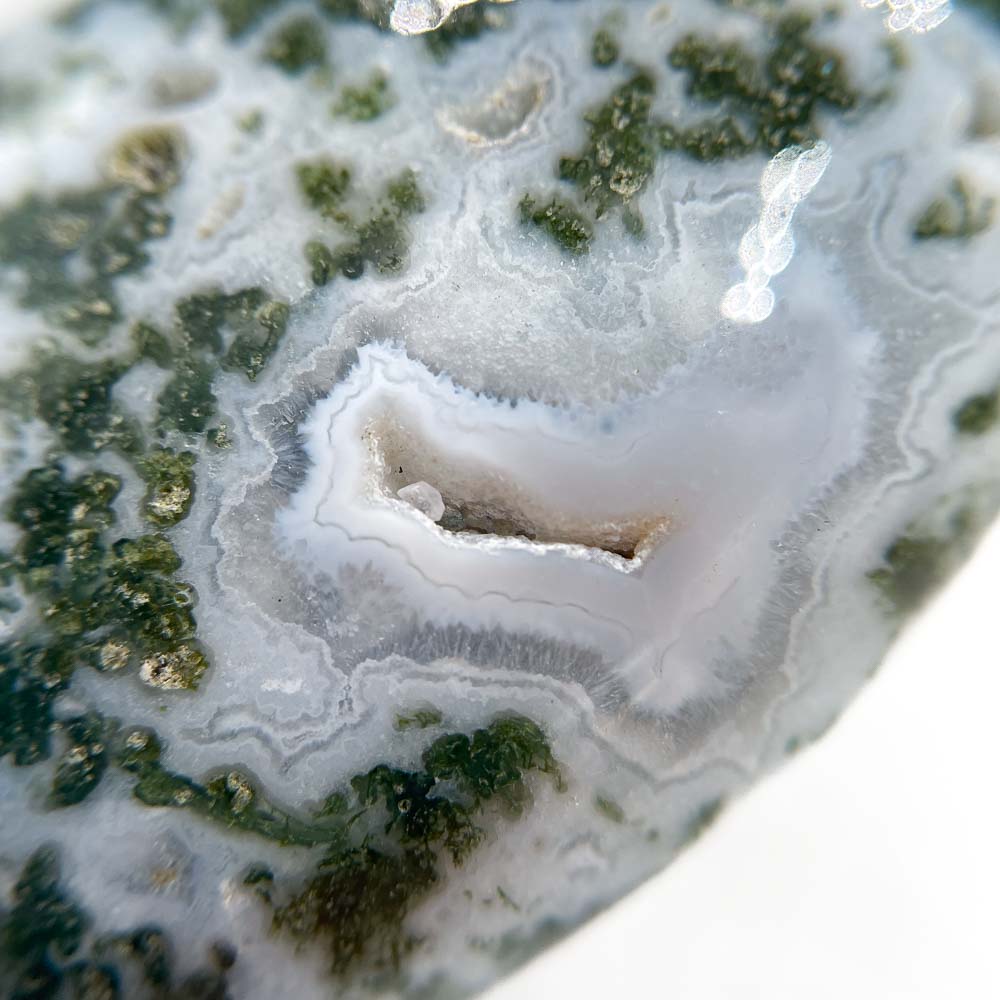 Этот вид агатов один из самых необычных: в каждом камне рисунок напоминает или прозрачное озеро с водорослями вокруг или сыр с плесенью, если сам камень белого цвета