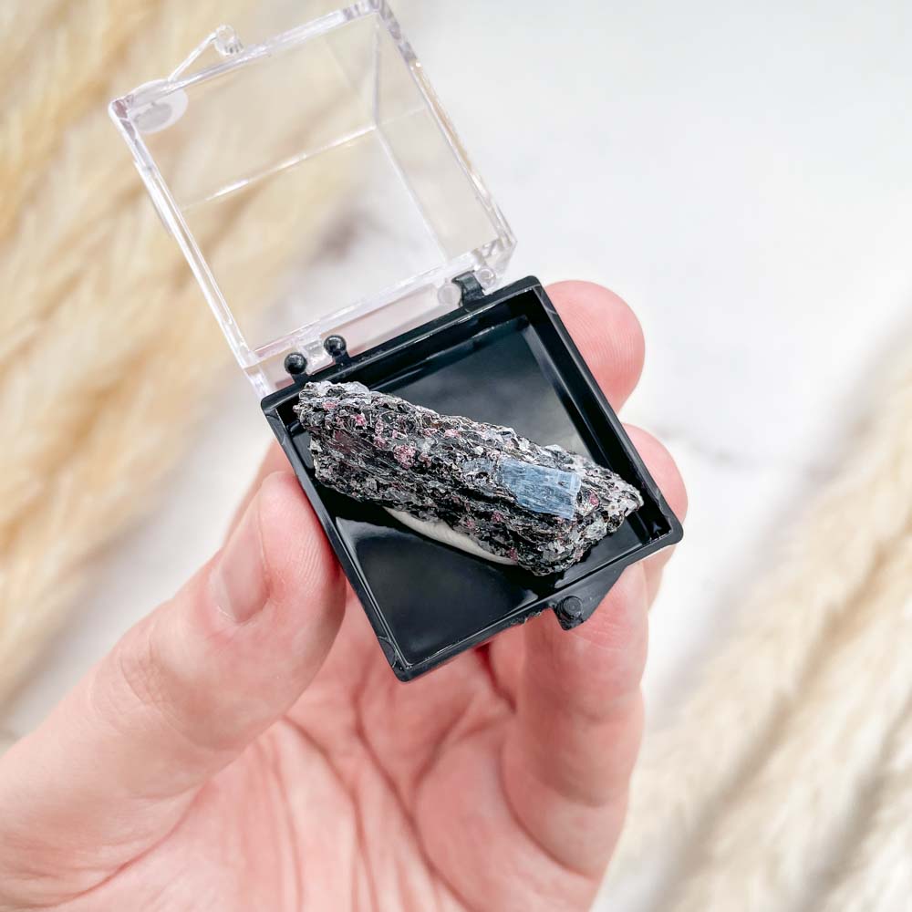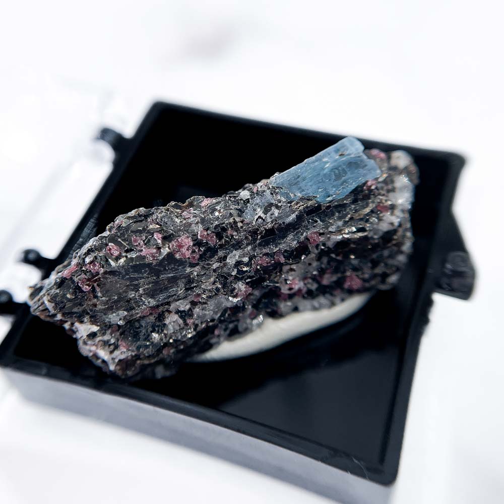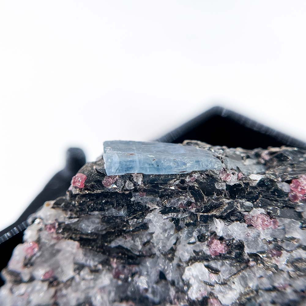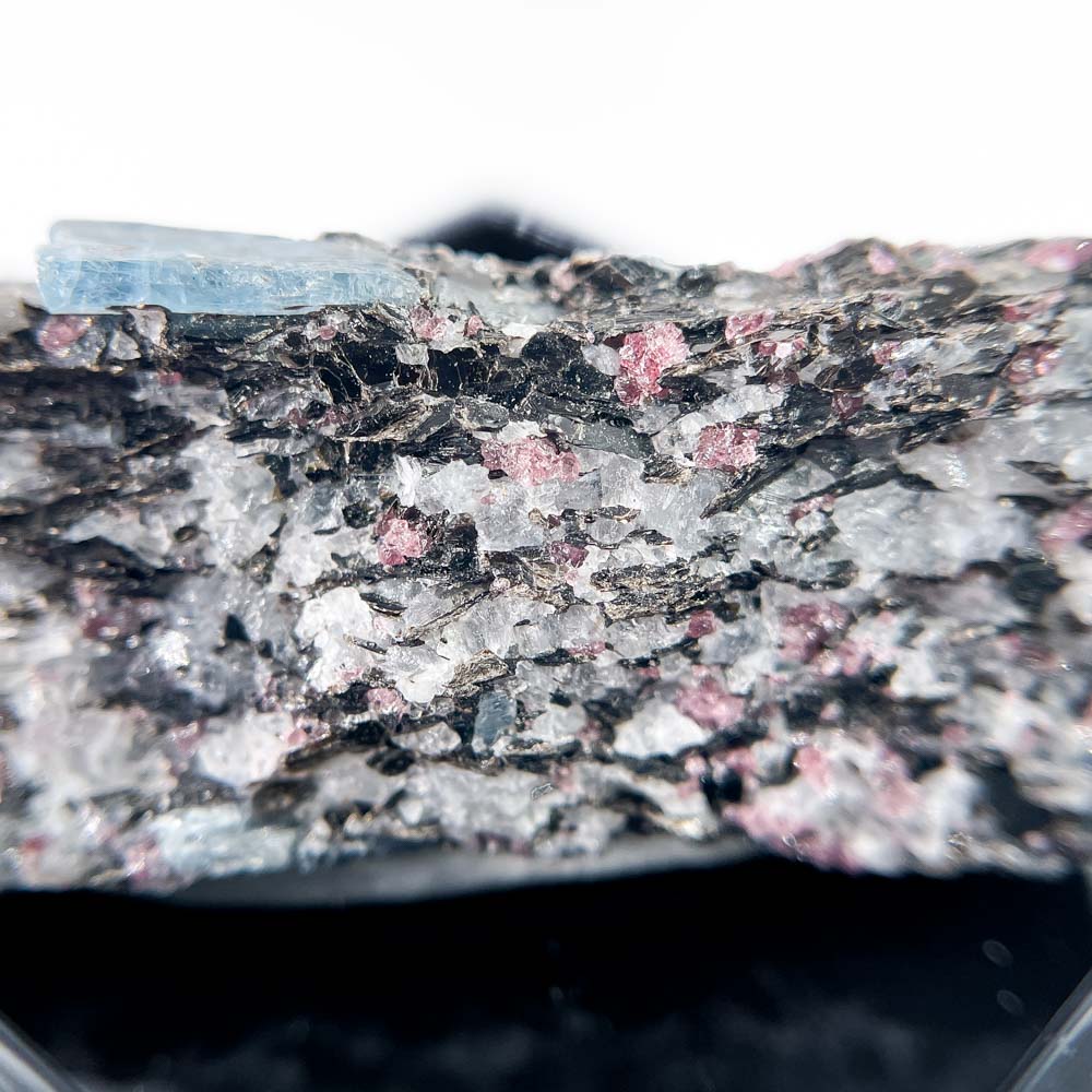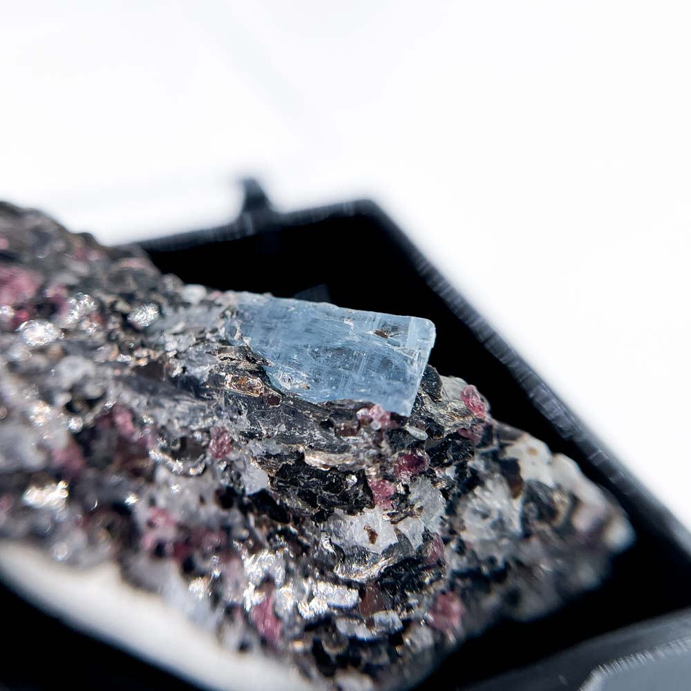 Данный кианит является длинными пластинчатыми кристаллами голубовато-прозрачных или синих оттенков, образованных силикатом алюминия. Но в природе также встречается кианит чёрного, желтоватого и зеленоватого цвета.