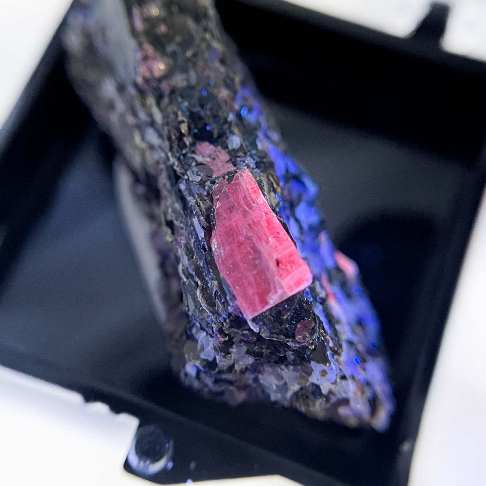 При ультрафиолете (УФ) дает яркий красный цвет.