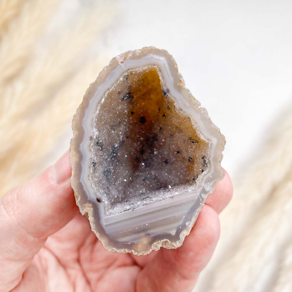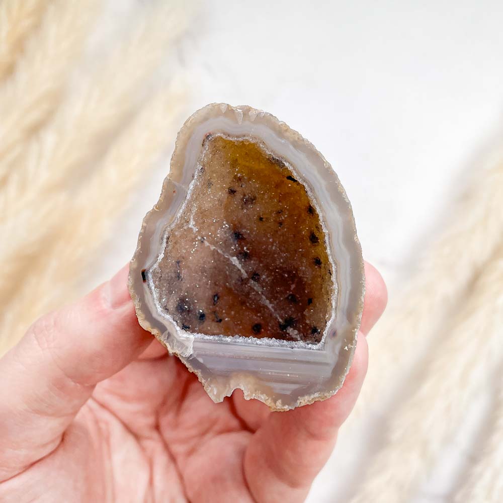 Агат - отличный камень для знакомства с миром камней и минералов. Его можно назвать камнем-собакой. Он будет верным другом, помощников в делах и не даст в обиду. Камень помогает сглаживать углы, находить компромисс в любых ситуациях. Агат даёт ощущение спокойствия, умиротворения. Достаточно просто несколько минут рассматривать его узоры чтобы расслабиться и насладиться красотой камня.