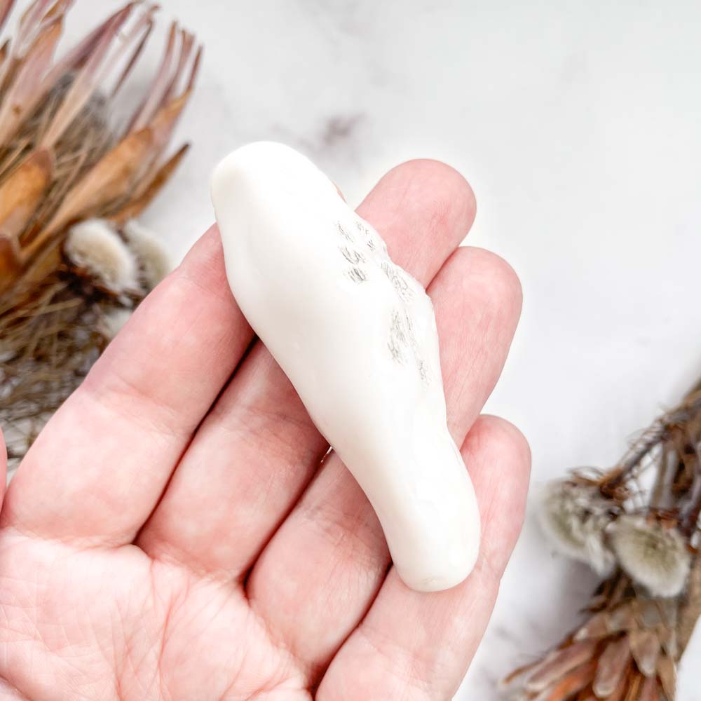 Белый кахолонг может со временем стать серым или желтоватым. Это связано с его микропористостью. Очистить можно обычным канцелярским ластиком или зубной пастой и щёткой. Но если это не поможет - не переживайте, загрязнение это часть жизнь камня и в этом нет ничего страшного.