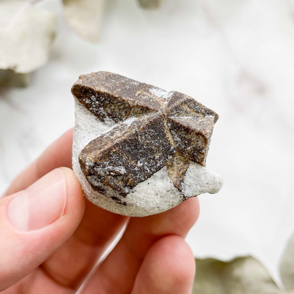 Ставролит — силикат алюминия и железа; необычный минерал, образующий сростки кристаллов, напоминающие по форме крест, чаще всего кристаллы располагаются под углом в 60 градусов, но редко бывают и под 90.  Иначе ставролиты называют крестовыми камнями.