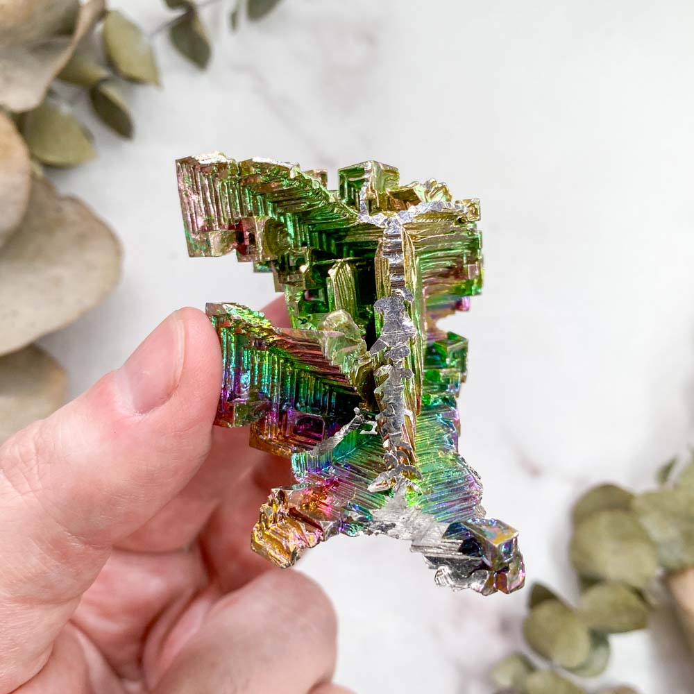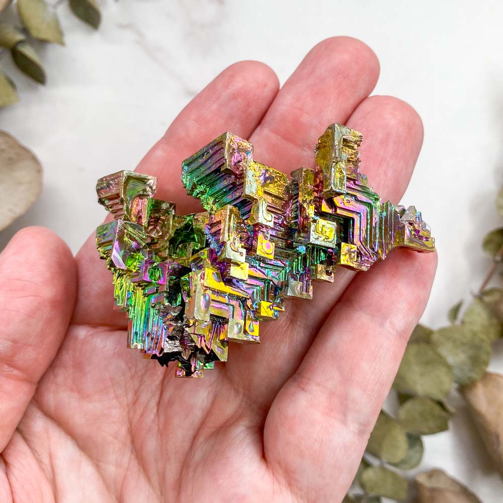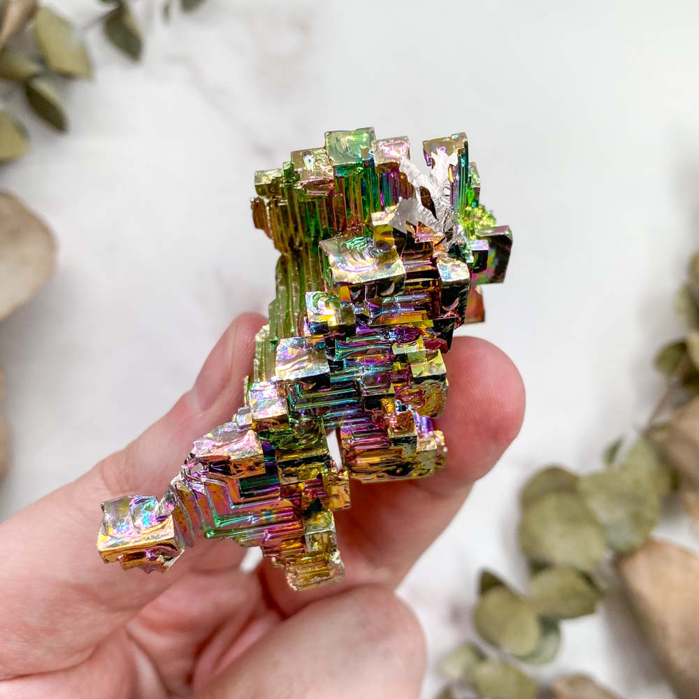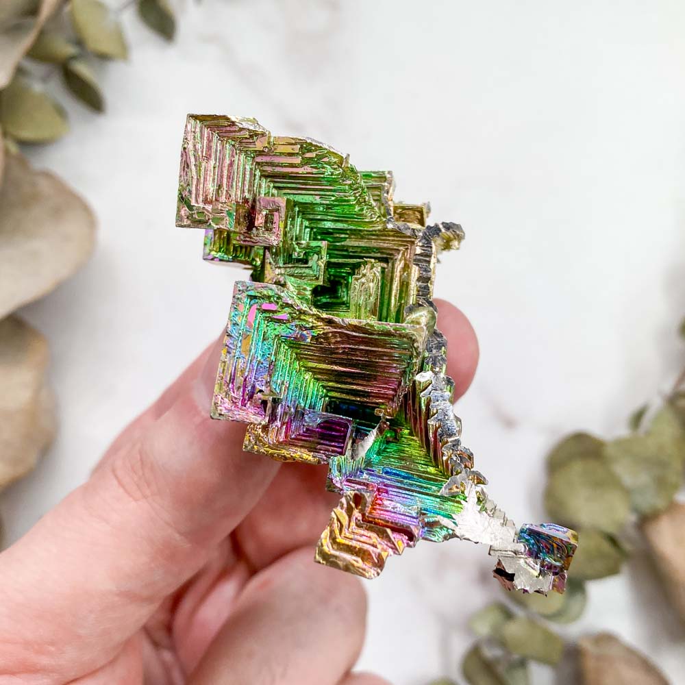 Особенностью висмута являются скелетные кристаллы, задающиеся природными закономерностями. Скелетный кристалл - это пустотелые или искаженные формы, являющиеся как бы каркасом кристалла, выросшего параллельно ребрам или граням. Подобные формы получаются при большой разнице роста по различным направлениям, или в вязкой среде при высокой концентрации вещества (в нашем случае это расплавленный металл очень большой чистоты). При сильном перенасыщении раствора, условиях очень вязкой среды и большого количества примесей на гранях некоторые формы начинают развиваться как отрицательные. То есть там, где должны быть пирамиды роста, образуются пирамидальные полости. В результате и получаются скелетные кристаллы.