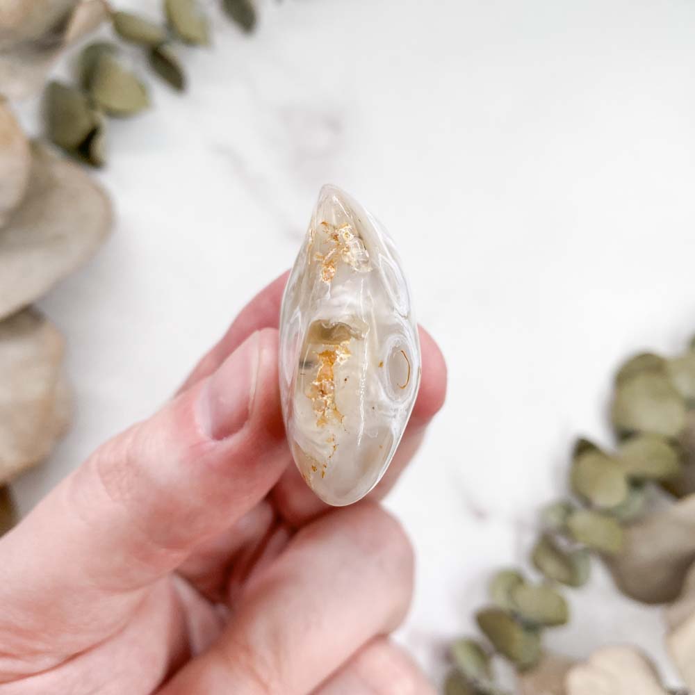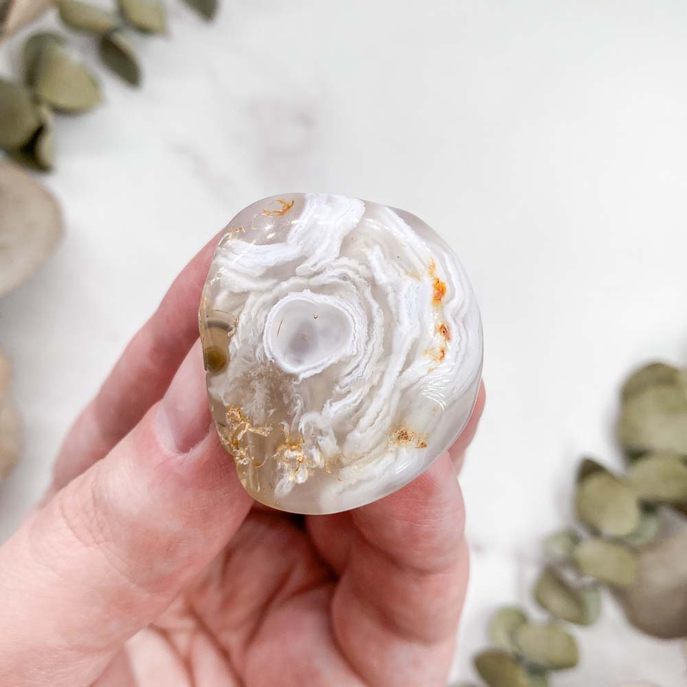 Этот вид агатов один из самых необычных: в каждом камне рисунок напоминает или прозрачное озеро с водорослями вокруг или сыр с плесенью, если сам камень белого цвета