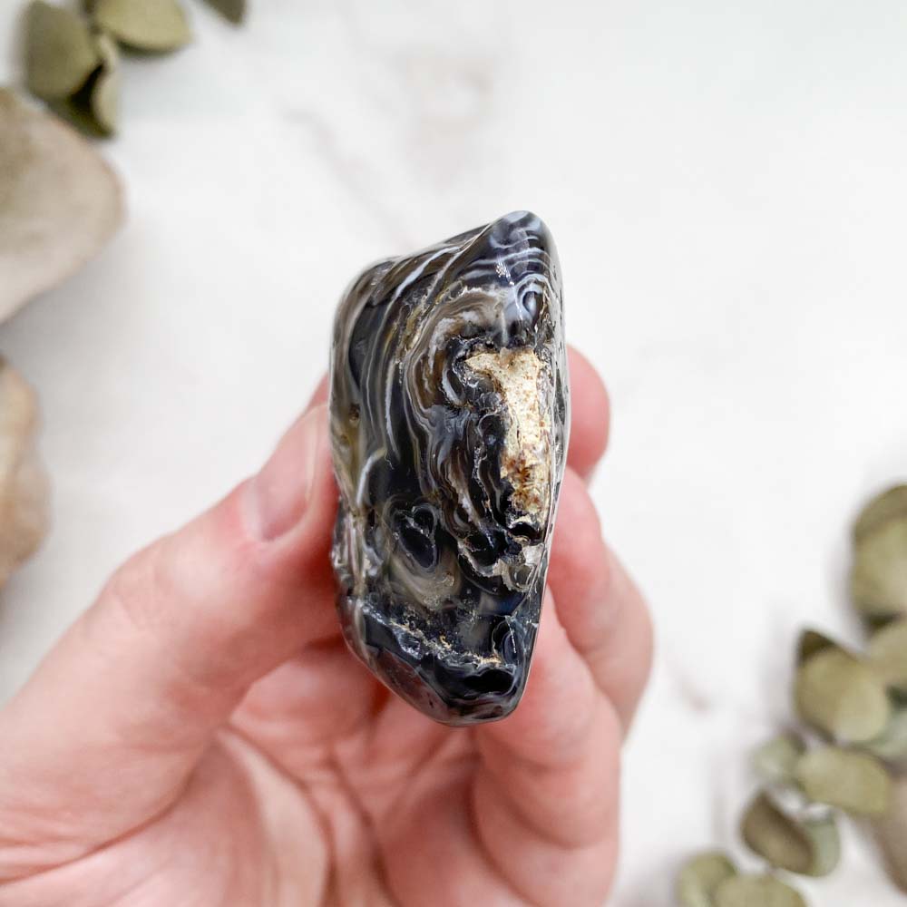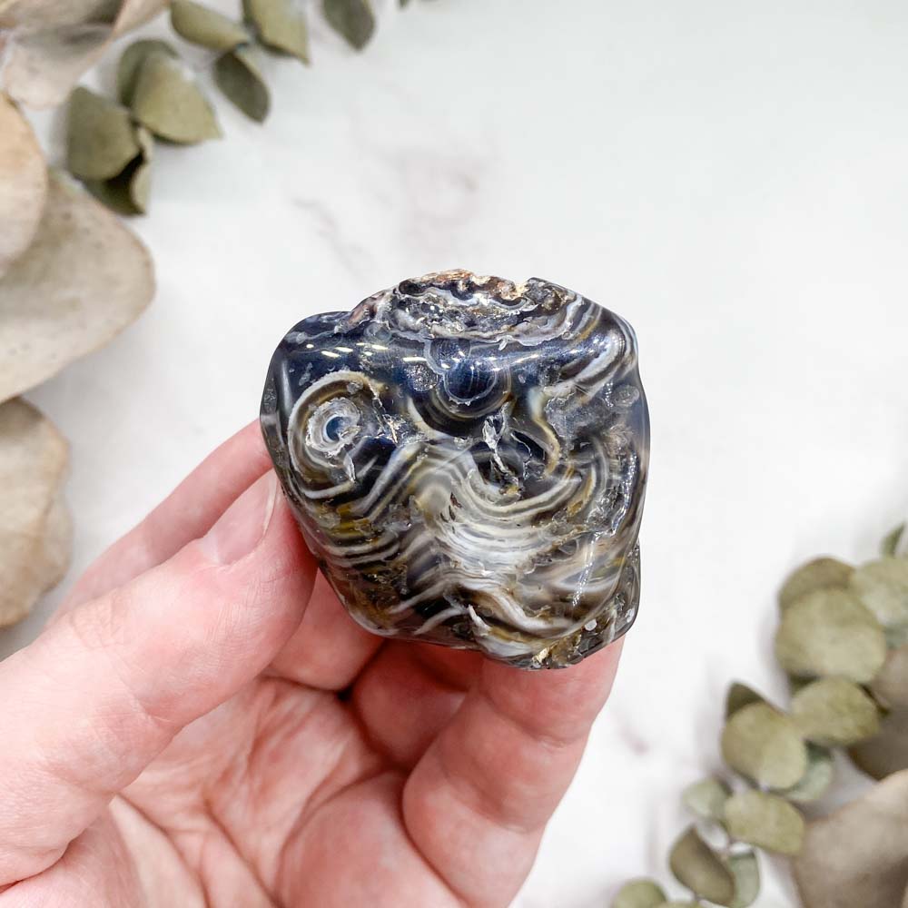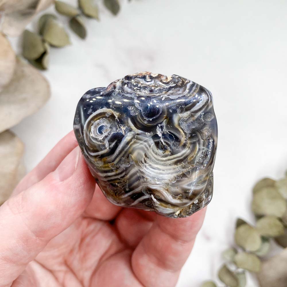 Агат - отличный камень для знакомства с миром камней и минералов. Его можно назвать камнем-собакой. Он будет верным другом, помощников в делах и не даст в обиду. Камень помогает сглаживать углы, находить компромисс в любых ситуациях. Агат даёт ощущение спокойствия, умиротворения. Достаточно просто несколько минут рассматривать его узоры чтобы расслабиться и насладиться красотой камня