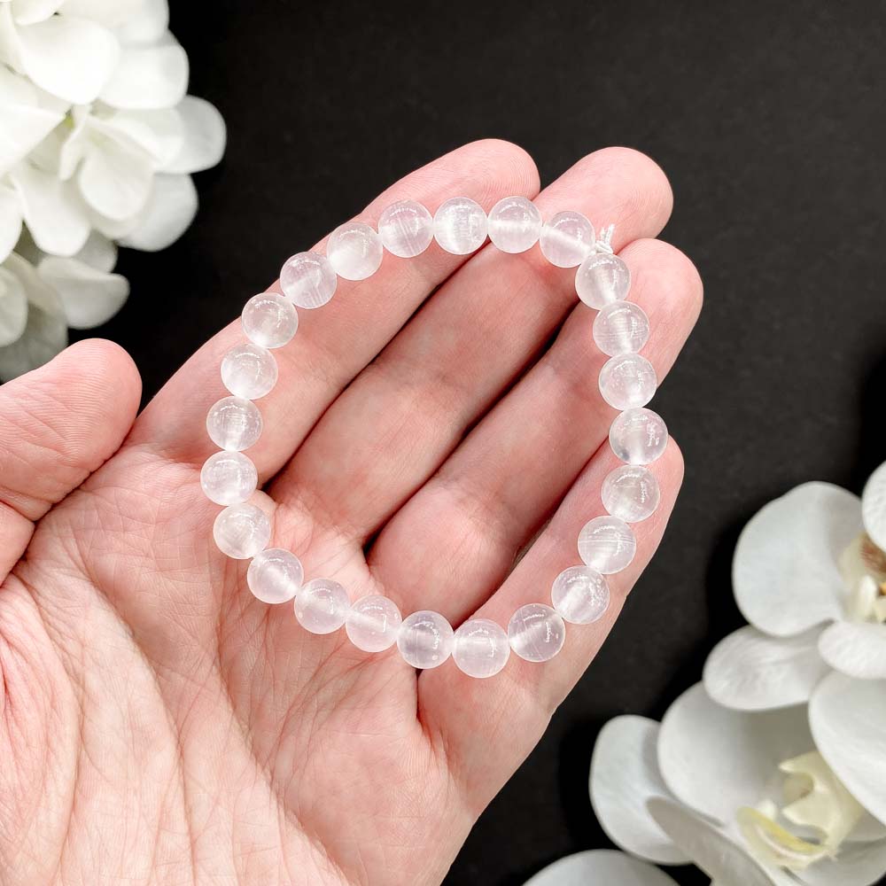 Селенит - это волокнистая разновидность минерала гипса, которая обладает шелковистым отливом. Такой эффект получается из-за строения камня. Свет скользит по тонким трубочкам из которых состоит камень и отражается в виде блика.