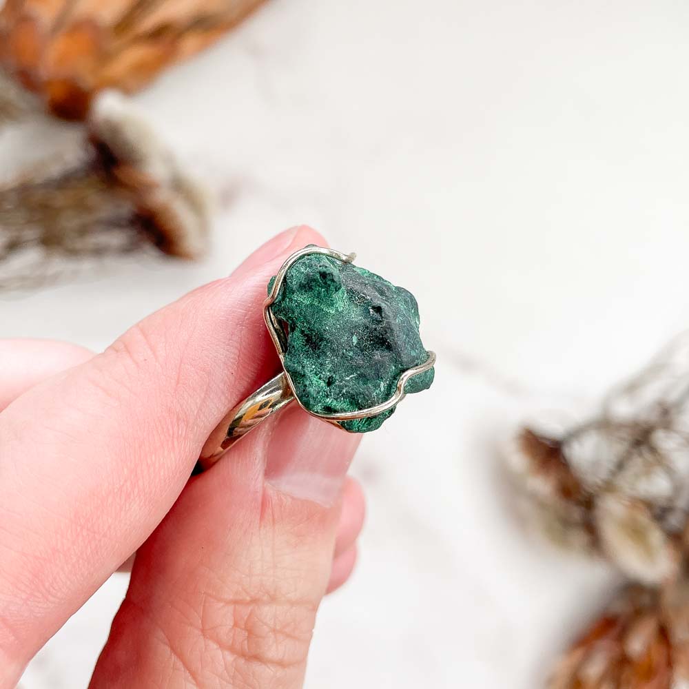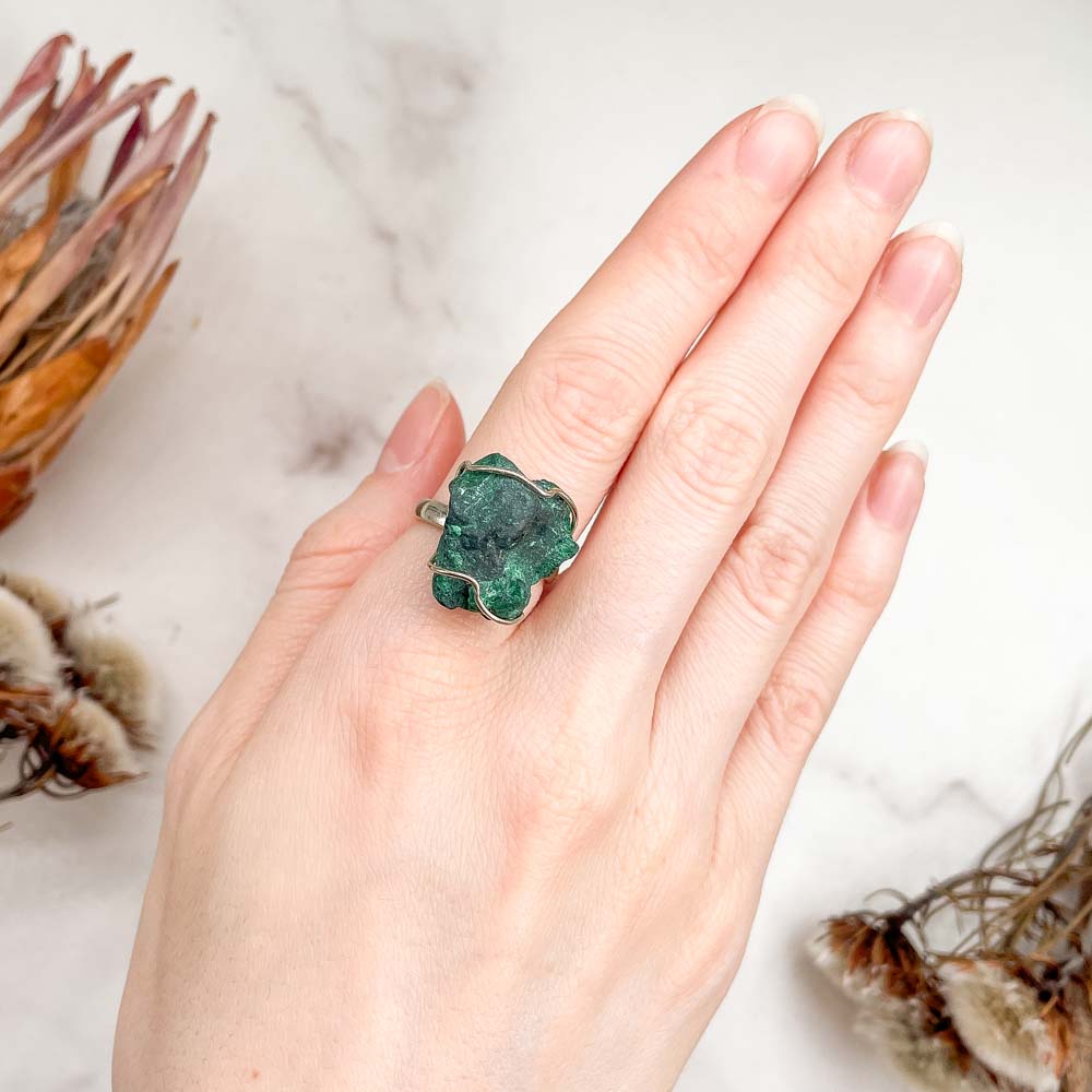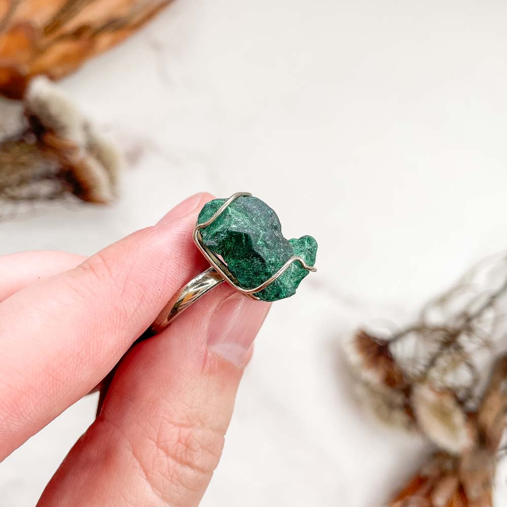 Малахит, который представлен на фото это отдельная разновидность, называемая кристаллической или бархатной. Он встречается намного реже, чем простой сырьевой малахит и обычно в украшениях используется в необработанном виде. Коллекционеры и просто любители минералов также стараются сохранить кристаллическое строение минерала. Нежное скольжение света по камню происходит из-за того, что такой малахит состоит из сотен мелких расщепленных кристаллов, растущих в пустотах на большой глубине.
